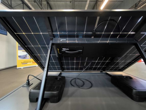 Le français Sunology propose un kit photovoltaïque plug-and-play de 450 Wc avec un compartiment sous le panneau pouvant recevoir une batterie de 700 Wh de capacité. © Pascal Poggi pour XPair