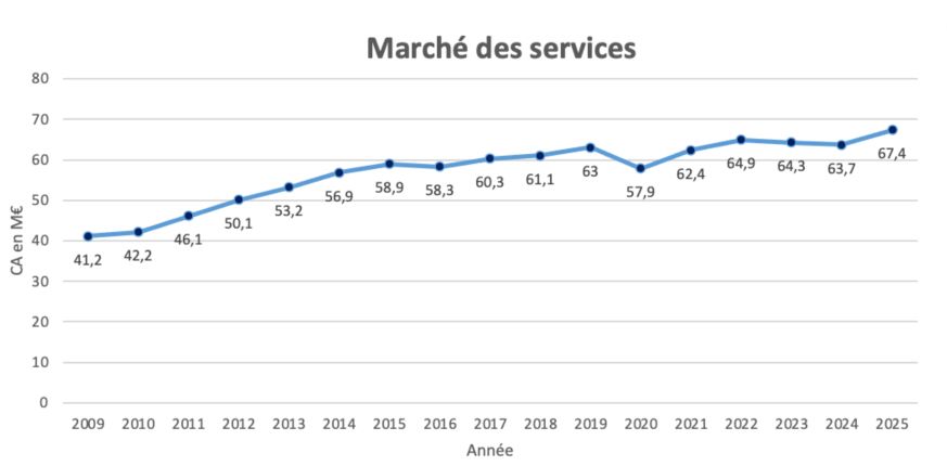 Côté services, la croissance s'élève à 5,8 % et le marché s'établit à 67,4 millions d'euros pour 2025. ACR entend par services l'assistance technique, la formation, la fourniture de matériels de rechange, le dépannage ou encore les contrats de maintenance.